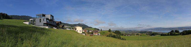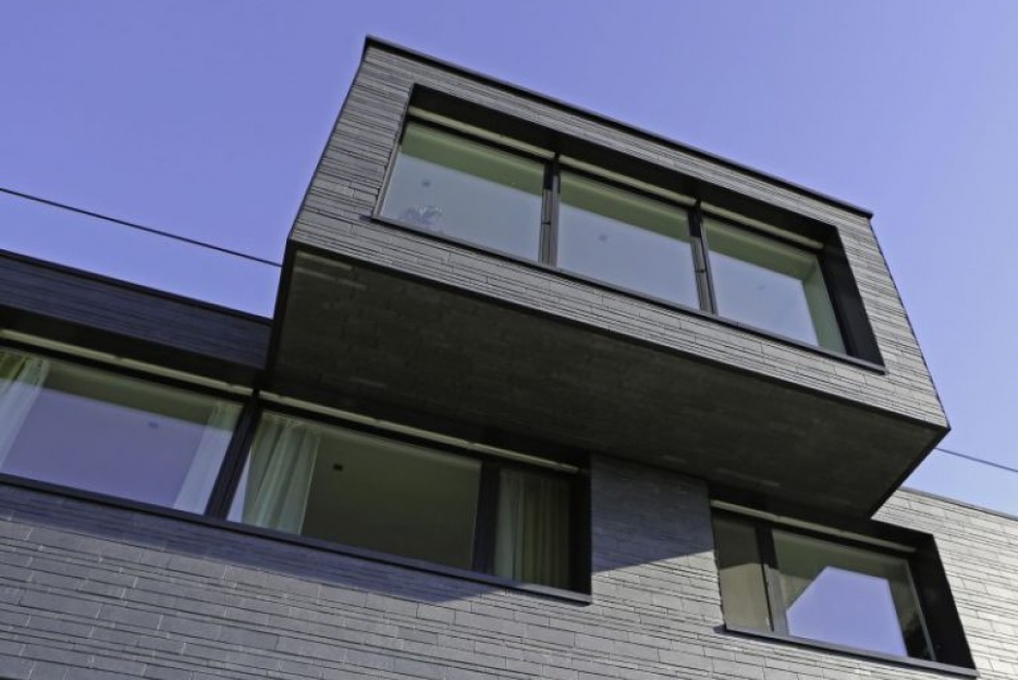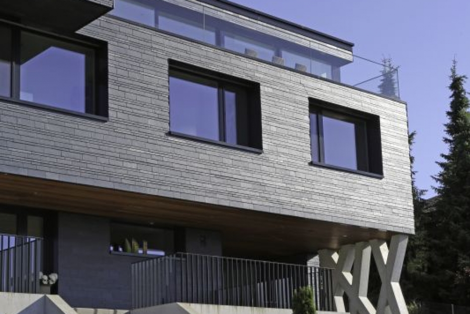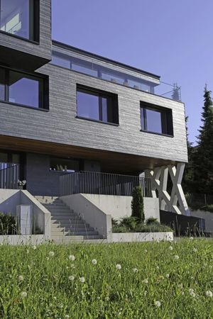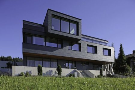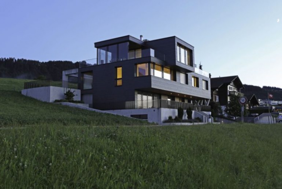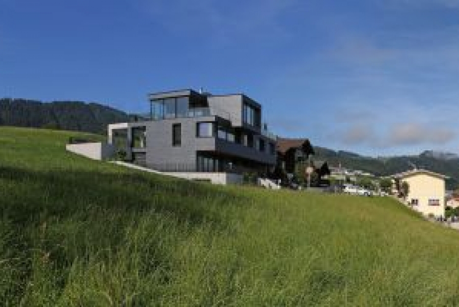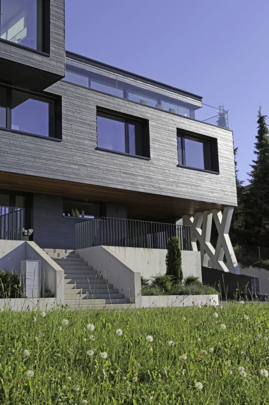 Tak fascynujące położenie budynku na stoku trzeba sobie wypracować ciężką pracą. Jasny beton, „wprasowany” w górę zabezpiecza dolne piętra przed panującymi tu ciężkimi warunkami atmosferycznymi, solidna fasada z łupka chroni zaś ściany kondygnacji wyższych. By zachować wymagane własności termiczne domu, architekci musieli wszystko dokładnie zaplanować. Niezwykle, a zarazem zdumiewająco prosto zostały rozwiązane połączenia tarasów i elementów wystających poza główną bryłę budynku. Podczas gdy izolacja termiczna fasady w postaci 18-to centymetrowej warstwy wełny mineralnej spełnia wysokie standardy izolacyjności, to płyty izolacyjne ze spienionego poliuretanu o grubości nawet do 22-tu centymetrów na tarasach i wystających elementach budynku wymuszają zazwyczaj pewne kompromisy dotyczące zabezpieczania cieplnego na łączeniach elementów wewnętrznych z zewnętrznymi. Inaczej jest w tym wypadku. Architekci wewnątrz budynku przewidzieli betonowe stropy o grubości 48 centymetrów. Wraz z jastrychem pływającym grubość stropu zwiększa się do 60 centymetrów. Masywne stropy wewnątrz budynku zwężają się z zewnątrz do 26 centymetrów, przez co można zainstalować izolację termiczną wymaganą zewnątrz budynku. Przejścia z wewnątrz na zewnątrz są więc solidnie i pewnie rozwiązane. Masywne betonowe stropy i ściany zapewniają dużą kumulację ciepła w przegrodach i bardzo dobrą izolację akustyczną pomieszczeń.