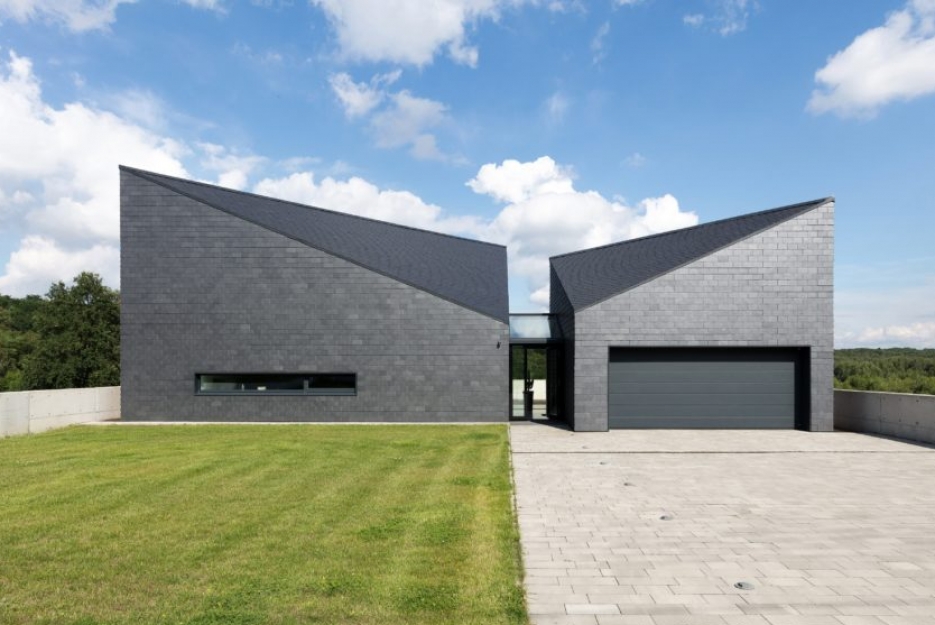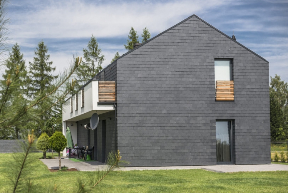 Klarowne linie i uporządkowana optyka w parze z naturalną strukturą pokryć łupkowych nadają dachom i fasadom charakterystyczną nutę nowoczesnego stylu.