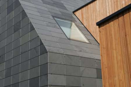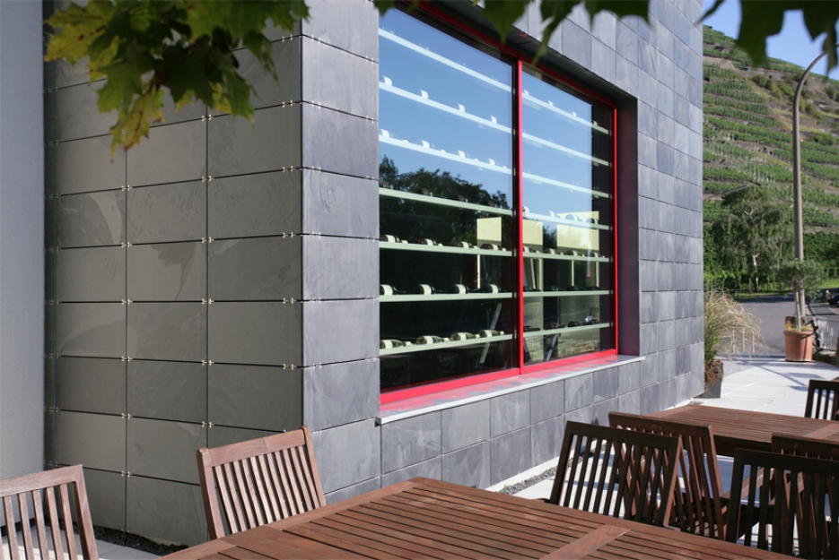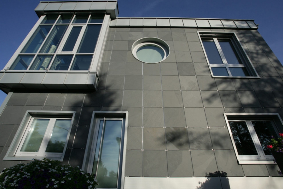 Płyty łupkowe zawieszane są na haki ze stali nierdzewnej, które wcześniej mocowane są do aluminiowej konstrukcji. System fasadowy jest tak zaprojektowany aby zniwelować rozszerzalność termiczną wszystkich elementów składowych elewacji. Różne formaty łupka pozwalają na swobodne kreowanie fasady i pełną optymalizację i dopasowanie do geometrii budynku.