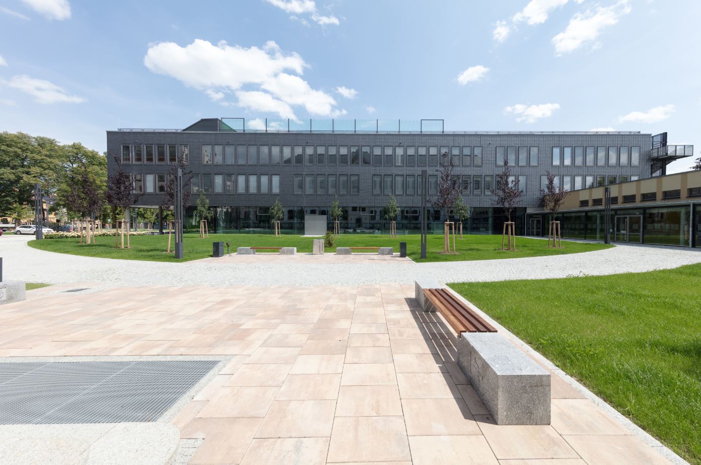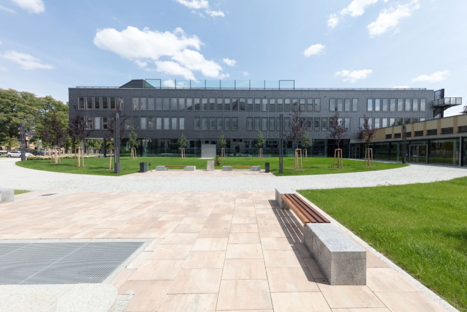 Historyczny, główny budynek kompleksu jest pokryty łupkiem naturalnym. Stąd też wytyczne, by nowy budynek też został pokryty łupkiem, tak by powstało nawiązanie między nowoczesnością i historią tego miejsca. Architekt: „przy obiektach użyteczności publicznej rzadko stosuje się kamień na dachy czy elewacje z tego względu że uchodzi on za materiał drogi. Nowe sposoby krycia są jednak tak przemyślane i zaprojektowane, że pokrycie fasady łupkiem nie wiąże się już z ogromnymi wydatkami, a zdarzają się także sytuacje że łupek jest tańszy niż typowe materiały okładzinowe. W dodatku w razie uszkodzenia danej płytki można ją łatwo i szybko wymienić, co ułatwia konserwację takiego budynku, a w efekcie czego pokrycie to staje się jeszcze ekonomiczniejsze na przestrzeni lat”.