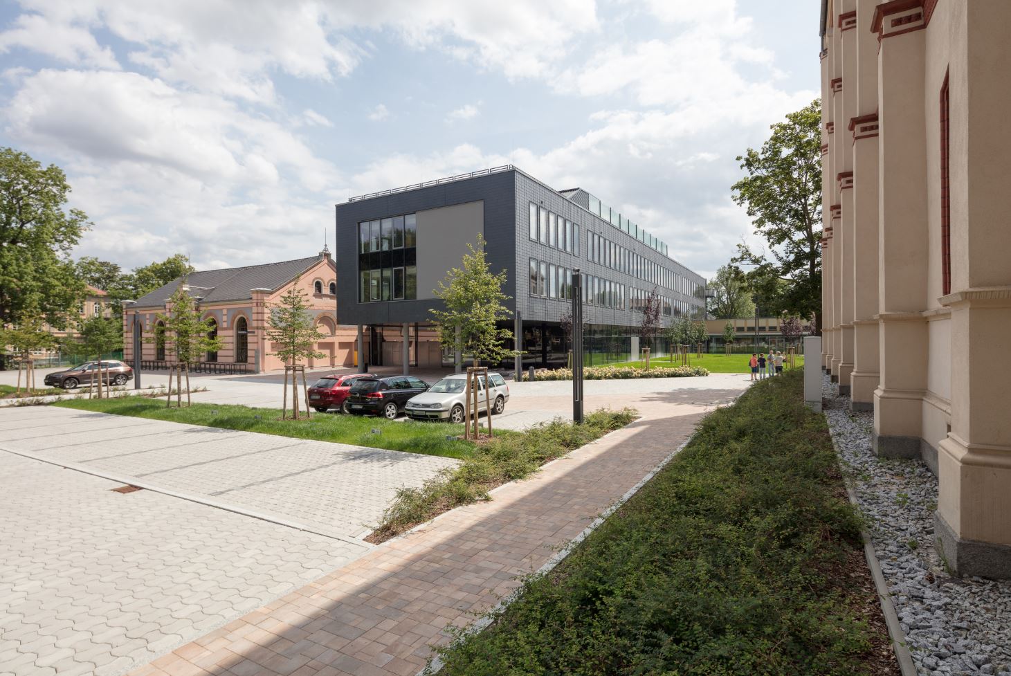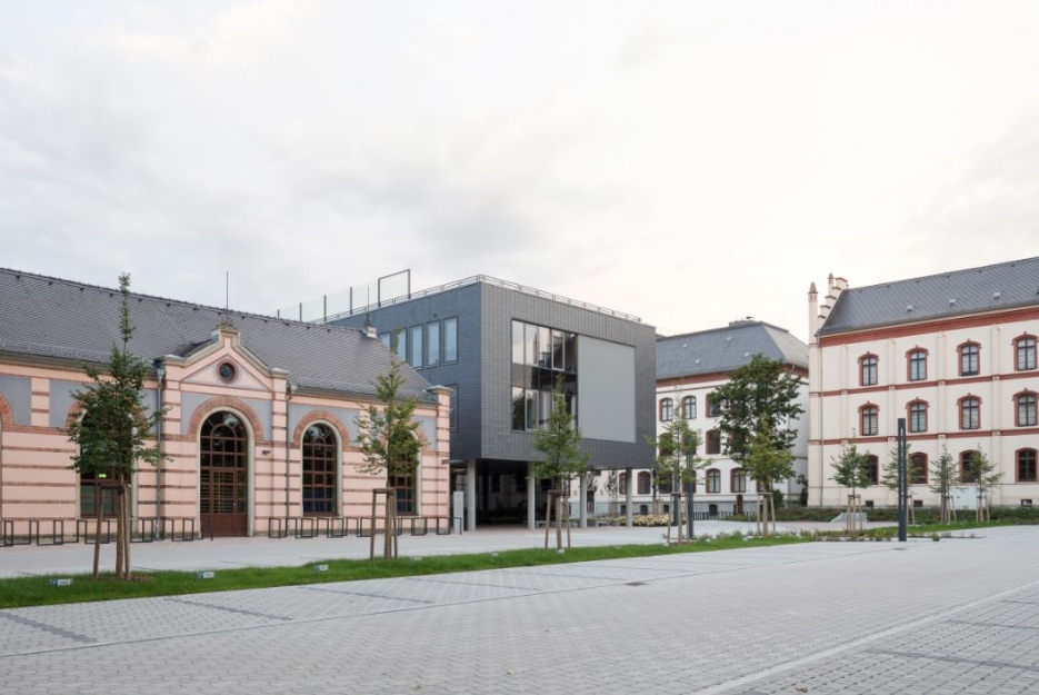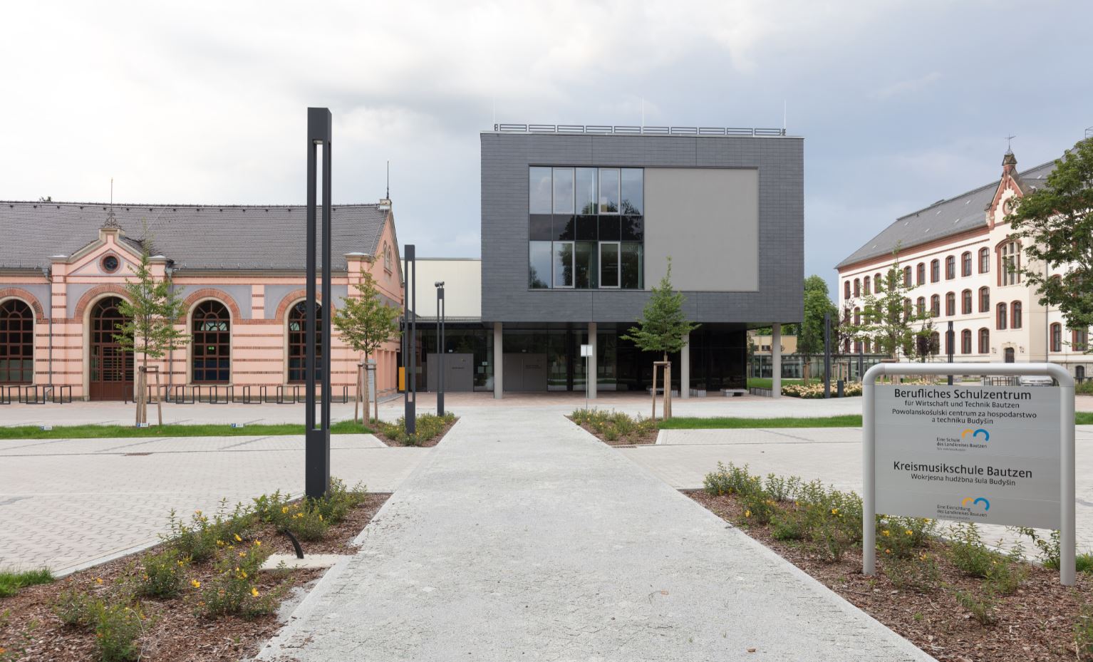 Najstarszy budynek kompleksu szkolnego Centrum Szkolnictwa Zawodowego w Bautzen pochodzi z 1857 roku i został zaprojektowany przez architekta Carla Augusta Schramma, kolegę Karla Friedricha Schinkla. Schramm dzięki ciężkiej, długiej pracy jest uznawany za jednego z najlepszych projektantów budynków administracyjnych, szkolnych i kościelnych. Okoliczne budynki mają wysoką wartość historyczną, więc rozbudowa kompleksu była niesamowicie delikatnym zadaniem.