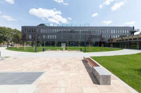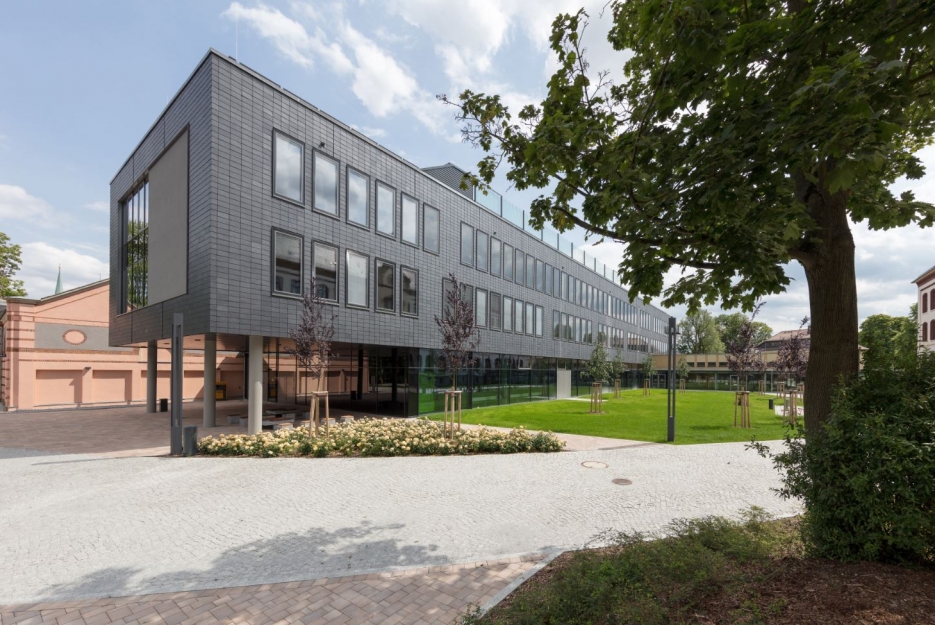 Historyczny zespół szkół musiał zostać rozbudowany, by móc przenieść wszystkie jednostki szkolnictwa zawodowego w jedno miejsce. Nowa budowla została posadowienia centralnie pomiędzy i z tyłu zabytkowych budynków, tak by trzy z czterech widoków zachowały rys historyczny. Główną bryłą budynku jest długi na 70 i szeroki na 17 metrów prostopadłościan. Na przyziemiu zastosowano fasady szklane, a na piętrach fasady z łupka naturalnego. Posadowienie budynku na słupach nadało z pozoru ciężkiej i topornej bryle nieco lekkości.