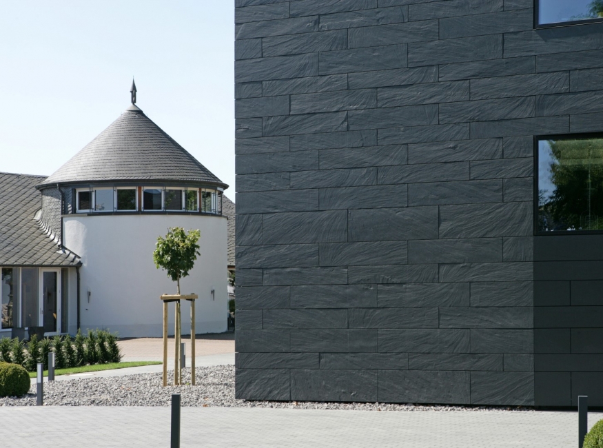 Kominy, attyki czy ściany szczytowe są piętą Achillesową w konstrukcji domów. Są najbardziej narażonymi na niszczycielskie warunki atmosferyczne elementami. Te elementy są często niezabezpieczone, przez co są bezpośrednio narażone na działanie deszczu, wiatru czy śniegu. Co po zakończeniu budowy wygląda dobrze, często musi być po niedługim czasie naprawiane umiejscowienie tych elementów wysoko ponad ziemią utrudnia to zadanie. W takich przypadkach warto zastosować prostokątne płytki z łupka, które są trwałe i nadają estetyczny wygląd. Takie płytki można zamocować niemal na każdej drewnianej konstrukcji. Dobrze wykonana wykładzina wytrzyma wiele długich lat. Inwestując niewiele właściciel domu ma pewność że jego domowi nie zaszkodzi żadna wichura. Możliwości wykonania jest mnóstwo, od nowoczesnej aż po tradycyjną formę. Łupki mogą być dostarczane w różnych kształtach i wymiarach, wystarczy je tradycyjnie przytwierdzić do drewnianej konstrukcji. Ogromna książka, pióro czy też piękna panorama- bracia Maik i Björn Fischer zajmujący się dekarstwem uchodzą także za mistrzów układania łupka na domach. Są rzemieślnikami z zamiłowania i tradycji, a także noszą tytuły: pierwszy vice mistrza a drugi mistrza świata w dekarstwie. Według życzeń inwestorów upiększają fasady i szczyty domów różnymi motywami i wzorami: „Obrazy i wzory można wkomponować w każdy rodzaj krycia. Zaletą łupka jest to że występuje w różnych kolorach i w zależności od natężenia światła za każdym razem inaczej połyskuje” ,mówi mistrz dekarski Maik Fischer. Jako wzór fachowcowi wystarczy szkic lub zdjęcie. Czy to trudne? „Nie, jeżeli się to potrafi robić”. Niesamowity efekt zastosowania łupka w ogrodzie dumnie prezentuje Pan Fischer na swoim własnym tarasie: ze zwykłego murka stworzył za pomocą łupka małe arcydzieło w stylu Gaudiego.
