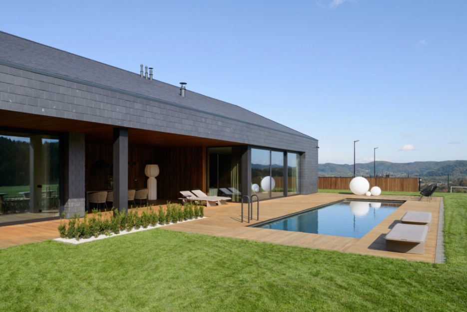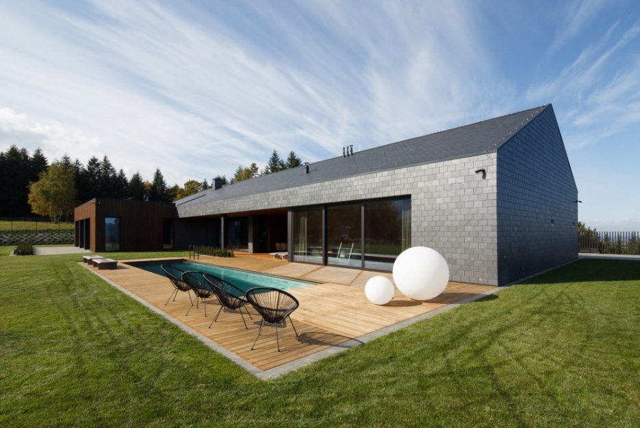 Łupek w zasadzie jest surowcem, który się nie zestarzeje. Szarość kamienia inwestorzy postanowili przełamać drewnem, z którego wykonany został taras i część elewacji. Wystrzegając się zasady, że „oszczędny płaci podwójnie” zdecydowano się na zastosowanie materiałów najwyższej jakości od razu. Niecka basenu wykonana została ze stali nierdzewnej, która zapewnia długotrwałą żywotność również bez przymusu wykonywania konserwacji. Wyeliminowano niemal wszystkie „sztuczne” materiały budowlane. Zamiast styropianu do izolacji ścian zastosowano wełnę mineralną, zamiast ogrzewania na paliwo stałe, zastosowano ogrzewanie na gaz.