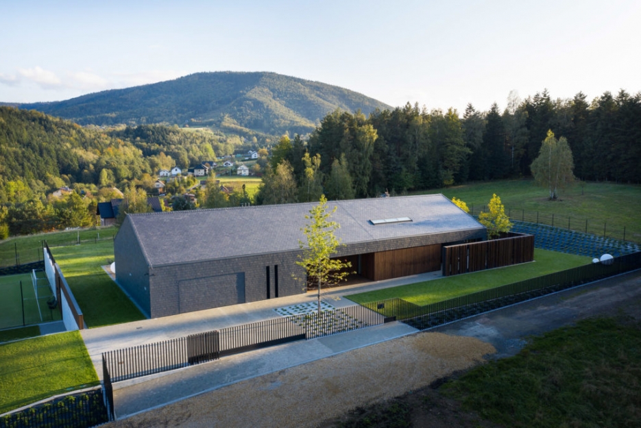 Inwestorzy chcieli stworzyć dom, który w możliwie minimalnym stopniu zakłóca otaczający krajobraz. Decyzja o wyborze naturalnych okładzin stanowi ukłon w stronę kontekstu otoczenia. Mimo dość dużego rozmiaru budynku nie ma tu agresji i wołania o uwagę. Wręcz przeciwnie dom „wtapia” się w pejzaż a efekt ten udało się uzyskać poprzez świadomy dobór naturalnych materiałów wykończeniowych oraz ograniczenie ich różnorodności.